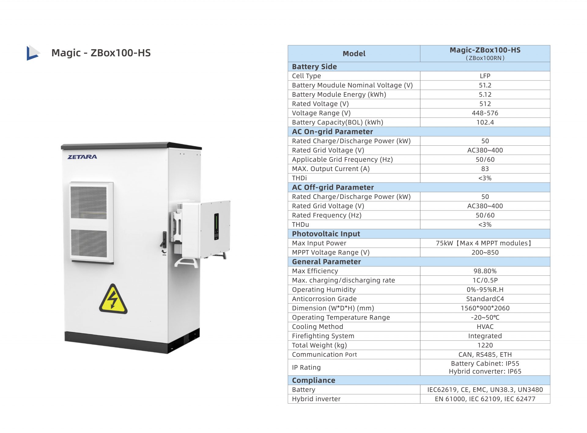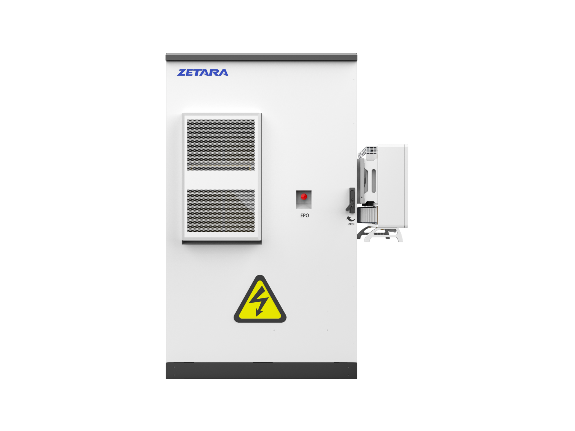 The system features outdoor housing suitable for any installation site, with easy maintenance enabled by a modular design, including battery modules, BMS, and DC modules.